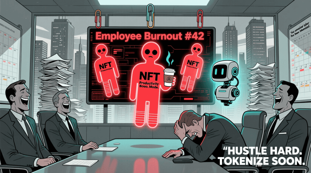 Your 80-hour workweek just became someone else’s asset. In a move that blends dystopia with Web3 delusion, several “innovative” startups have begun tokenizing employee burnout as NFTs—selling digital certificates of exhaustion as “proof of grind.” One company, HustleChain Inc., now offers “Burnout Badges” that verify you’ve pulled three all-nighters, cried in a Zoom call, or replied “I’m fine” while your soul evaporated. These NFTs are marketed as “career credibility tokens”—but really, they’re your suffering, minted and monetized by your boss.