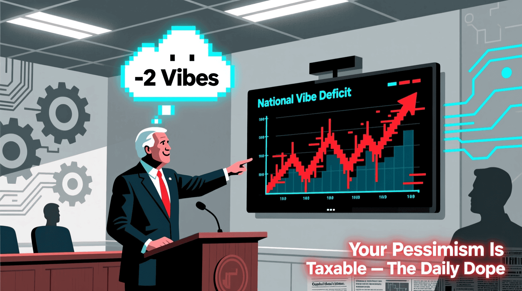 The pitch is deceptively patriotic: “If we all think positively, the economy will grow.” Bill sponsors claim the tax will “incentivize resilience,” “reduce national anxiety,” and “turn grief into GDP.” One representative declared: “Why pay for therapy when you can just pay the government to feel better?”